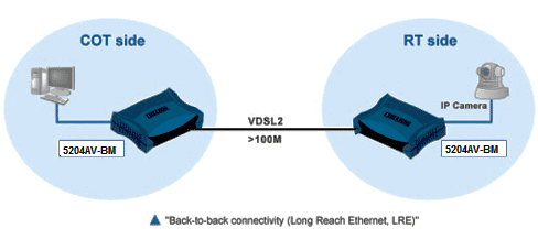 Long Reach Ethernet (LRE): Back-to back Applications In addition to using one the Data Connect 5204V-BM to connect to ISP/Telco’s DSLAM for accessing Internet or video services, users can utilize a pair of the Data Connect 5204V-BM for back-to-back applications. Theoretically the maximum length for Ethernet cable is within 100 meters. With two Bridge Modems users can have 100/100Mbps connectivity over a twisted pair phone line up to 200meter longer. This Capability can help users to bridge two distinct LAN segments in longer distance or have to surveillance service a little farther over existing twisted-pair phone cable.