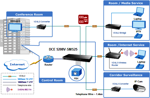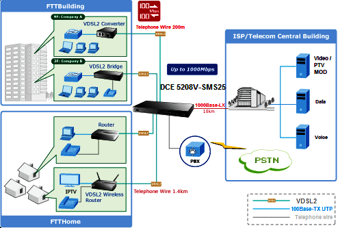 Delivers High-Demand Services Connectivity for ISP / Triple Play Devices As the demand of home broadband connections increases for home-communication and entertainment needs,VDSL2 technology is the next step media support the integration of home services and provide significant faster transmission speed than current cable modems and ADSL technology. The DCE 5208V-SMS25 applies the EoVDSL (Ethernet over VDSL) to provide up to 100Mbps download capability and brings many Multi-Media services come true on local network: